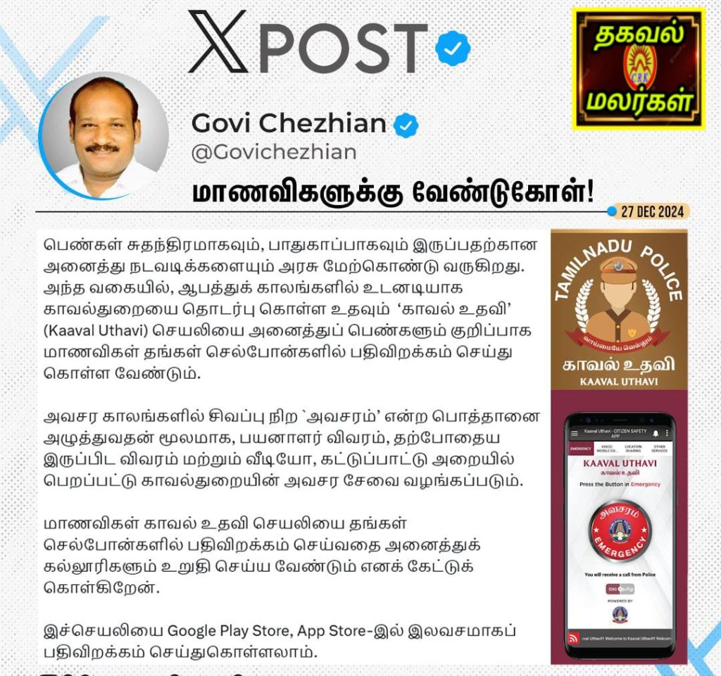 🇮🇳தகவல் மலர்கள்🇮🇳ғʀɪᴅᴀʏ 𝟮𝟳, ᴅᴇᴄ. 𝟮𝟬𝟮𝟰★❀━━━━🄲🅁🄺━━━━❀★.#XPOST🔹🔸மாணவிகள் காவல் உதவி செயலியை தங்கள் செல்போன்களில் பதிவிறக்கம் செய்வதை அனைத்துக் கல்லூரிகளும் உறுதி செய்ய வேண்டும்”-கோவி.செழியன், உயர்கல்வித் துறை அமைச்சர்✍️. பெண்கள் சுதந்திரமாகவும், பாதுகாப்பாகவும் இருப்பதற்கான அனைத்து நடவடிக்களையும் அரசு மேற்கொண்டு வருகிறது.அந்த வகையில், ஆபத்துக் காலங்களில் உடனடியாக காவல்துறையை தொடர்பு கொள்ள உதவும் ‘காவல் உதவி’ (Kaaval Uthavi) செயலியை அனைத்துப் பெண்களும் குறிப்பாக மாணவிகள் தங்கள் செல்போன்களில் பதிவிறக்கம் செய்து கொள்ள வேண்டும்.▪️. அவசர காலங்களில் சிவப்பு நிற `அவசரம்’ என்ற பொத்தானை அழுத்துவதன் மூலமாக, பயனாளர் விவரம், தற்போதைய இருப்பிட விவரம் மற்றும் வீடியோ, கட்டுப்பாட்டு அறையில் பெறப்பட்டு காவல்துறையின் அவசர சேவை வழங்கப்படும்.▪️. மாணவிகள் காவல் உதவி செயலியை தங்கள் செல்போன்களில் பதிவிறக்கம் செய்வதை அனைத்துக் கல்லூரிகளும் உறுதி செய்ய வேண்டும் எனக் கேட்டுக் கொள்கிறேன்.இச்செயலியை Google Play Store, App Store-இல் இலவசமாகப் பதிவிறக்கம் செய்துகொள்ளலாம்.. பெண்களிடம் தகாத பாலியல் உறவுகள் கொண்டதால் ஆபிரிக்காவில் சாமானில் கல்லை கட்டி தண்டனை கொடுக்கும் காட்சி முக்கிய தகவல் ரயில்வே துறையில் தேர்வு இல்லாத 4232 காலிப்பணியிடங்களுக்கு விண்ணப்பிக்க விண்ணப்பங்கள் அழைப்பு! அப்ளை செய்ய || South Central Railway Recruitment 2024https://bitly.cx/zn5C மின்சார துறை நிறுவனத்தில் வெளியாகியுள்ள புதிய பணியிடங்களுக்கு விண்ணப்பங்கள் வரவேற்பு! விண்ணப்பிக்க || POWERGRID Company Secretary Professional Job 2024https://bitly.cx/RNYP ╝ 🔴𝘽𝙍𝙀𝘼𝙆𝙄𝙉𝙂 𝙉𝙀𝙒𝙎.💥🔹🔸தூத்துக்குடி மாவட்டம், மீளவிட்டான் கிராமத்தில்ரூ.32.50 கோடி மதிப்பீட்டில் 63,000 சதுர அடி பரப்பில் தரைத் தளம் மற்றும் 4 தளங்களுடன் கட்டப்பட்டுள்ள மினி டைடல் பூங்கா கட்டடத்தினை முதலமைச்சர் மு.க.ஸ்டாலின் திறந்து வைத்தார்🇮🇳தகவல் மலர்கள்🇮🇳𝐒𝐮𝐧𝐝𝐚𝐲 𝟮𝟵, 𝐃𝐞𝐜. 𝟮𝟬𝟮𝟰╚════★🄲🅁🄺★════╝ Share The News Post navigation Today news &Awerness news 1-சிபில் வழக்கு நிலுவையில் இருக்கும்போது பத்திரம் எப்படி செய்ய வேண்டும் 2-பத்திரப்பதிவு மாறுகிறது