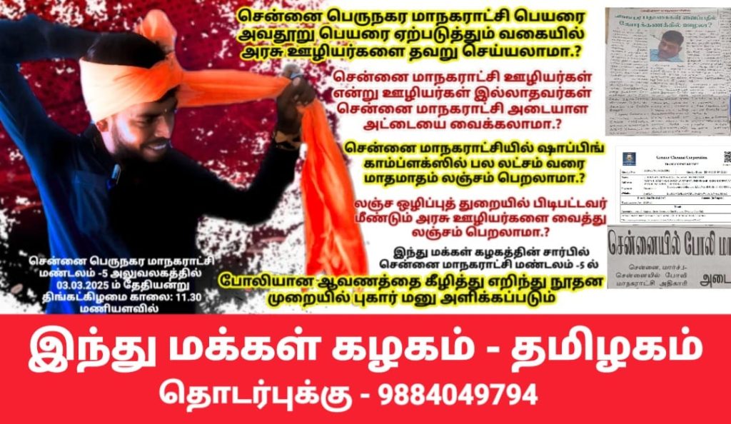 சென்னை பெருநகர மாநகராட்சியில் சென்னை மாநகராட்சி ஆணையர் குமார குருபரன் அவர்களை பெயரை அவதூறு செய்யவும், சென்னை பெருநகர மேயர் பிரியா அவர்கள் பெயரை அவப்பெயர் ஏற்படுத்தி வரும் வகையில்சென்னை மாநகராட்சி மண்டலம் -5 ல் குறிப்பிட்ட ஒரு சில வார்டுகளில் சென்னை மாநகராட்சியில் பணியில் இல்லாத நபர்கள் சென்னை மாநகராட்சி ஊழியர்கள் என்று போலி அடையாள அட்டை வழக்கிய நபர்கள் மீது புகார்லஞ்சம் பெற்ற வழக்கில் சிக்கிய நபர்களை வைத்து ஷாப்பிங் காம்ப்ளக்ஸ் முழுவதும் மாத மாதம் லட்சக்கணக்கில் லஞ்சமாக பெறும் நபர்கள் மீதும் புகார்ஹோட்டல், நிறுவனங்கள், ஷாப்பிங் காம்ப்ளக்ஸ், சென்னை மாநகராட்சி நிறுவனங்கள் மீதும் போலியான முறையில் ஆவணத்தை தயார் செய்து அத்துமீறி பணம் வசூலிப்பவர் மீது புகார் 3/03/2025 நாளை காலை .11.30 மணியளவில் ஆவணங்களோடு சென்னை மாநகராட்சி மண்டலம் 5-ல் உள்ள வடசென்னை வடக்கு மாவட்ட சென்னை மாநகராட்சி இணை ஆணையர் அவர்களிடம் சமூக ஆர்வலர் ஆர்.டி.ஐ செல்வம் தலைமையில் புகார்இவண்