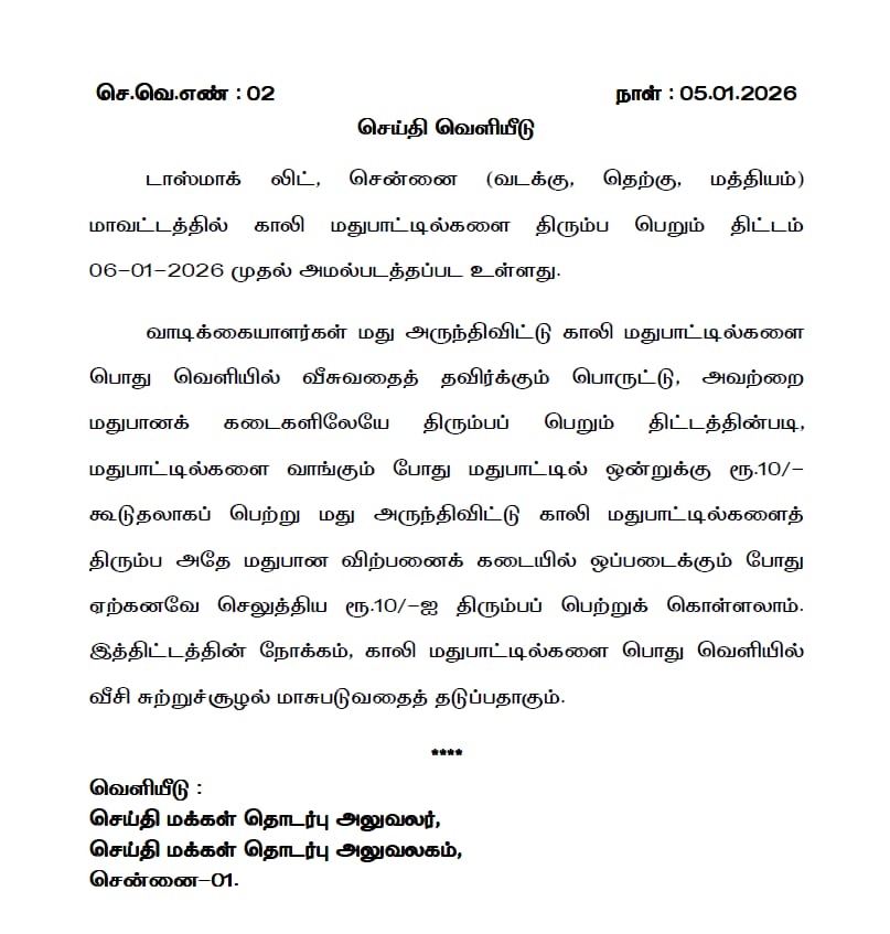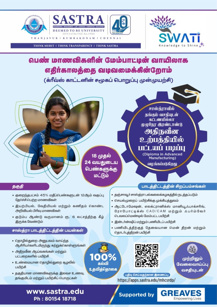 🔹🔸சென்னையில் உள்ள டாஸ்மாக் கடைகளில் காலிப் பாட்டில்களை திரும்பப் பெறும் திட்டம் நாளை (ஜன. 06) முதல் அமலுக்கு வருகிறது🇮🇳தகவல் மலர்கள்🇮🇳𝟬𝟱, 𝐌𝐨𝐧𝐝𝐚𝐲 𝐉𝐚𝐧. 𝟮𝟬𝟮𝟲★❀━━━━🄲🅁🄺━━━━❀★ சாஸ்த்ரா பல்கலைக்கழகம் மற்றும் கிரீவ்ஸ் காட்டன் நிறுவனத்தின் சமூகப் பொறுப்புணர்வு திட்டத்தின் கீழ் பெண்களுக்கு இலவச டிப்ளமோ படிப்பு – விண்ணப்பங்கள் வரவேற்பு!தஞ்சாவூர்: தஞ்சாவூர் சாஸ்த்ரா நிகர்நிலைப் பல்கலைக்கழகம் (SASTRA Deemed University) மற்றும் கிரீவ்ஸ் காட்டன் (Greaves Cotton) நிறுவனத்தின் கூட்டு முயற்சியில், பெண் மாணவிகளின் முன்னேற்றத்திற்காக “அதிநவீன உற்பத்தியில் பட்டயப் படிப்பு” (Diploma in Advanced Manufacturing) எனும் இரண்டு ஆண்டுகால முழுநேரப் படிப்பு அறிமுகப்படுத்தப்பட்டுள்ளது.இத்திட்டத்தின் நோக்கம், பொருளாதாரத்தில் பின்தங்கிய மற்றும் திறமையான பெண் மாணவிகளுக்கு நவீனத் தொழில்நுட்பக் கல்வியை வழங்கி, அவர்களைத் தொழில்முறை வல்லுநர்களாக உருவாக்குவதாகும்.இத்திட்டத்தின் சிறப்பம்சங்கள்:முற்றிலும் இலவசம்: இந்தப் படிப்பிற்கான கல்விக்கட்டணம், தங்குமிடம் மற்றும் உணவு அனைத்தும் 100% இலவசமாக வழங்கப்படும்.பயிற்சி முறை: தஞ்சாவூர் சாஸ்த்ரா வளாகத்தில் நடைபெறும் இந்தப் படிப்பில் செய்முறைப் பயிற்சிக்கு அதிக முக்கியத்துவம் அளிக்கப்படும்.நவீனத் தொழில்நுட்பம்: ஆட்டோமேஷன், எலக்ட்ரானிக்ஸ் மேனுஃபேக்சரிங், ரோபோட்டிக்ஸ், CAD/CAM மற்றும் ஃபார்ம்வேர் டெவலப்மெண்ட் போன்ற அதிநவீனத் துறைகளில் பயிற்சி அளிக்கப்படும்.வேலைவாய்ப்பு: படிப்பு முடித்தவுடன் தகுதியான மாணவிகளுக்குப் பணிவாய்ப்பு மற்றும் இன்டர்ன்ஷிப் வசதிகள் ஏற்படுத்தித் தரப்படும்.விண்ணப்பிக்கத் தகுதிகள்:12-ஆம் வகுப்பில் இயற்பியல், வேதியியல் மற்றும் கணிதப் பாடப்பிரிவுகளில் குறைந்தது 45% மதிப்பெண்களுடன் தேர்ச்சி பெற்றிருக்க வேண்டும்.18 முதல் 24 வயதுடைய பெண்கள் மட்டுமே விண்ணப்பிக்க முடியும்.குடும்ப ஆண்டு வருமானம் ரூ. 6 லட்சத்திற்கு மிகாமல் இருக்க வேண்டும்.விண்ணப்பிக்கும் முறை:விருப்பமுள்ள மாணவிகள் https://apps.sastra.edu/mhcsrdp/ என்ற இணையதள முகவரியில் தங்களைப் பதிவு செய்து கொள்ளலாம். கூடுதல் விவரங்களுக்கு 80154 18718 என்ற எண்ணைத் தொடர்பு கொள்ளலாம் அல்லது www.sastra.edu என்ற இணையதளத்தைப் பார்க்கலாம்.பெண் கல்வி மற்றும் வேலைவாய்ப்பை மேம்படுத்தும் இந்த அரிய வாய்ப்பைப் மாணவிகள் பயன்படுத்திக் கொள்ளுமாறு சாஸ்த்ரா நிர்வாகம் கேட்டுக் கொள்கிறது. Share The News Post navigation 🎉முக்கிய ✍️✨செய்திகள்🎊 🎉முக்கிய ✨செய்திகள்🙋