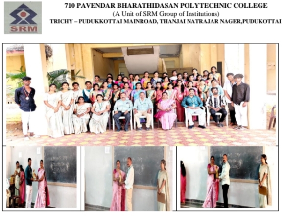 பாவேந்தர் பாரதிதாசன் தொழில்நுட்ப கல்லூரி 07-03-2026 (A Group of SRM Institutions- Pudukkottai Campus) மகளிர் தின விழா சிறப்பாக கொண்டாடப்பட்டது. நிகழ்ச்சியில் சிறப்பு விருந்தினராக திருமதி S.நிர்மலாராணி Administrative Officer, One stop Centre, Pudukkottai. கலந்துகொண்டார். உடன் கல்லூரி முதல்வர் துறை தலைவர்கள் பேராசிரியர்க மற்றும் மாணவர்கள் கலந்துகொண்டனர்கல்லூரியில் நடைபெற்ற பல்வேறு போட்டிகளில் வெற்றி பெற்ற மாணவ மாணவியர்களுக்கும், புதுக்கோட்டை மாவட்டம் சமூக நலத்துறையின் கீழ் நடை பெற்ற குழந்தை திருமணம் ஒழிப்பு நிகழ்ச்சியில் மாவட்ட அளவில் நடைபெற்ற மௌன மொழி போட்டியில் முதல் பரிசு பெட்ர மாணவ மாணவியர்களுக்கு பரிசுகள் வழங்கி கௌரவிக்கப்பட்டது.மாணவி அபிரமி மூன்றாம் ஆண்டு DMLT பெண்களின் பெருமைகளை பற்றியும் சிறப்புகள் பற்றியும் உரையாற்றினார்.பெண்ணே!நீயின்றி அமையாது உலகெனின்நின் அறிவின்றி அமையாது ஒழுக்குஎன்ற வரிகளில் இருந்து மாணவி தன் பேச்சை தொடங்கினார்.பெண்கள் இன்று ராணுவம் விமானம் ஓட்டுதல் மருத்துவம் காவல்துறை போன்ற அனைத்து துறைகளிலும் சிறந்து விளங்குகின்றனர்.விழி தெரியாமல்செவி கேளாமல்வழி புரியாமல்மொழி அறியாமல்திரியும் தகைசால் அறிஞர்களின் குறிப்புகளையும் அறிந்து செயல்படுபவள் பெண். அறிவின் ஊற்று ஆரம்பக்கல்வி ஆசிரியை.மாமமன்னர் ராஜ ராஜ சோழனின் அவையில் வீற்றிருந்து அறிவுரை கூறி நல்லாட்சி நடைபெற உறுதுணையாக இருந்தது குந்தவை பிராட்டியார் என்னும் ஓர் பெண்.சேர சோழ பாண்டிய மன்னர்கள் மூவேந்தர்களையும் எதிர்த்து பெண்ணை ஆற்றை வடபெண்ணை தென்பெண்ணை என இரண்டாக பிரித்து வள்ளல் பாரியின் மகளுக்கும் மனம் முடித்தவளும் , ஒருபடி மேலே சென்று முக்கண் மகன் முருகனுக்கும் அறிவுரை கூறியவள் ஒவ்வை என்னும் ஓர் பெண்.இது பெண் கல்வி அறிவில் சிறந்து விளங்கியதர்க்கான ஓர் உதாரணம்.விடுதலை போராட்ட வீரர் நேதாஜி சுபாஷ் சந்திர போஸை காக்க தன் கணவனையே துப்பாக்கியால் சுட்டு வீழ்த்தியவள் நீரா ஆரிஇந்திய சீனா போரில் 300 சீனா வீர்ர்களை சுட்டுக்கொல்ல ஜஸ்வந்த் சிங் ராவத் என்னும் வீரருக்கு உதவியவர்கள் சோலா மற்றும் நீரா என்ற இரண்டு பெண்கள்இவர்களின் வீரம் பெண்கள் தாய் நாட்டின் மீது வைத்துள்ள பற்றை இவ்வுலகிற்கு பறைசாற்றுகிறது.தேவதாசி முறை ஒழிக்க சட்டசபையில் குரல் கொடுத்து வெற்றி கண்டவர் சட்டமன்ற உறுப்பினர் சத்யவானி முத்து. முதல் பெண் மருத்துவர் ஆனந்தி கோபால் ஜோஷி பெண் பொறியாளர் ஸோமயாஜீலு லலிதா போன்றவர்கள்சமுதாயத்தில் பெண்களின் பங்கு இன்றியமையாதது எனபதற்கு ஓர் சிறு உதாரணம்.உலகம் அறிந்த ஒரேமொழி பசி ஒரே கடவுள் உணவுஎன்பதை அறிந்து உணவளிப்பவள் பெண்.பெண்மையை போற்றுவோம்என்று தனது உரையை முடி